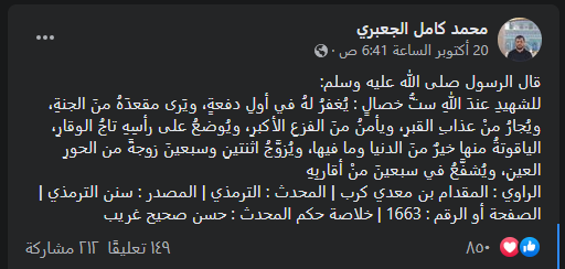 وفي أحد منشوراته التي كتبها في 20 أكتوبر 2022م، نشر الجعبري: “قال الرسول صلى الله عليه وسلم: للشهيدِ عندَ اللهِ ستُّ خصالٍ : يُغفرُ لهُ في أولِ دفعةٍ، ويَرى مقعدَهُ منَ الجنةِ، ويُجارُ منْ عذابِ القبرِ، ويأمنُ منَ الفزعِ الأكبرِ، ويُوضعُ على رأسِهِ تاجُ الوقارِ، الياقوتةُ منها خيرٌ منَ الدنيا وما فيها، ويُزوَّجُ اثنتينِ وسبعينَ زوجةً من الحورِ العينِ، ويُشفَّعُ في سبعينَ منْ أقاربِهِ”.