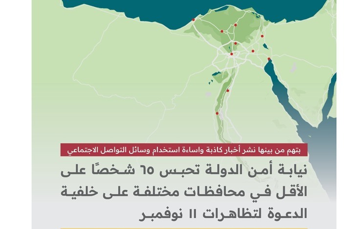 وأكدت وسائل إعلام مصرية، أن “أمن الدولة” اعتقل 65 شخصا، متهما إياهم بـ”الانضمام لجماعة إرهابية”، على خلفية دعوات التظاهر في 11/11.