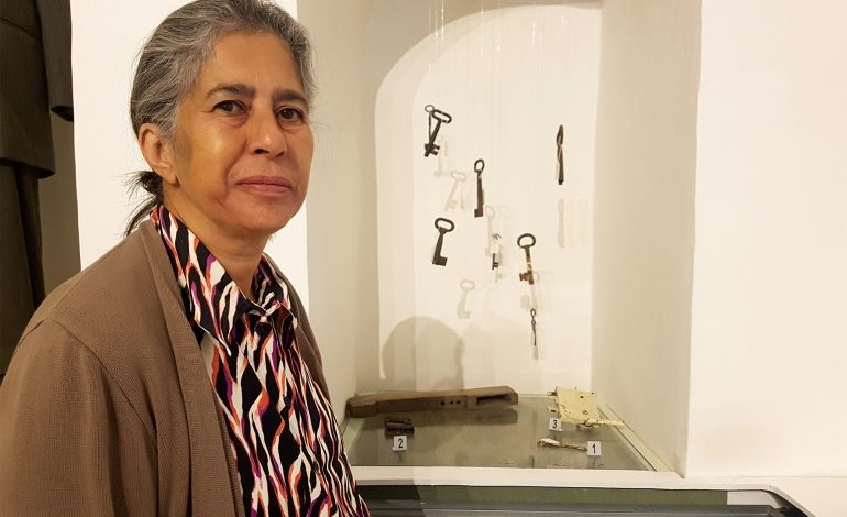 ومن زاوية أزياء دير ياسين مشت فاطمة بضع خطوات ثم تسمّرت أمام مجسم لقريتها تحتضنه قاعة العرض ذاتها، وعندما وقع نظرها على “كسّارة دار جندي” التي كان يملكها جدّها لأمها وقفت طويلا وسردت الحكايات التي لطالما سالت على لسان والدتها عن محجرة وكسّارة والدها.