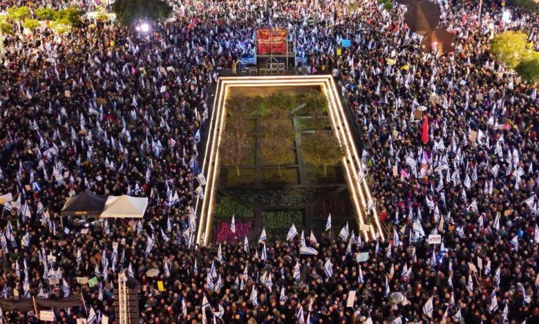 ووفقا لتقديرات الشرطة الإسرائيلية، فإن 80 ألف متظاهر وصلوا إلى ساحة “هبيما” في تل أبيب حيث المظاهرة المركزية احتجاجا على حكومة نتنياهو وخطة وزير القضاء الإسرائيلي، ياريف ليفين، التي تستهدف إضعاف جهاز القضاء وتقويض المحكمة العليا.