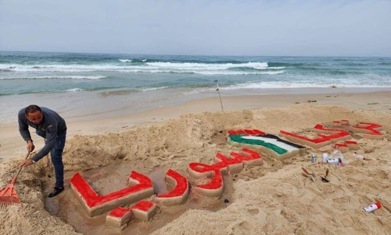 وتضمنت اللوحة التي رسمها الفنان محمد طوطح باستخدام رمال الشاطئ والألوان مجسمات لعلمي تركيا وسوريا، توسطتهما قبضة يد مرسوم عليها علم فلسطين.