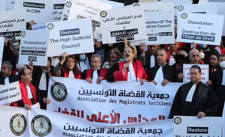 وأحصت المنظمة من بين الإجراءات الأخيرة ضد السلطة القضائية -التي اتخذها سعيّد منذ إمساكه بالسلطة في 25 يوليو/تموز 2021- رفض إعادة القضاة ووكلاء الجمهورية المعزولين، فضلا عن حل الرئيس في 12 فبراير/شباط 2022 من جانب واحد “المجلس الأعلى للقضاء” وهو هيئة دستورية مكلفة بضمان استقلال القضاء، إلى جانب منح نفسه سلطة التدخل في تعيين القضاة ووكلاء الجمهورية، ومساراتهم الوظيفية، وعزلهم.
