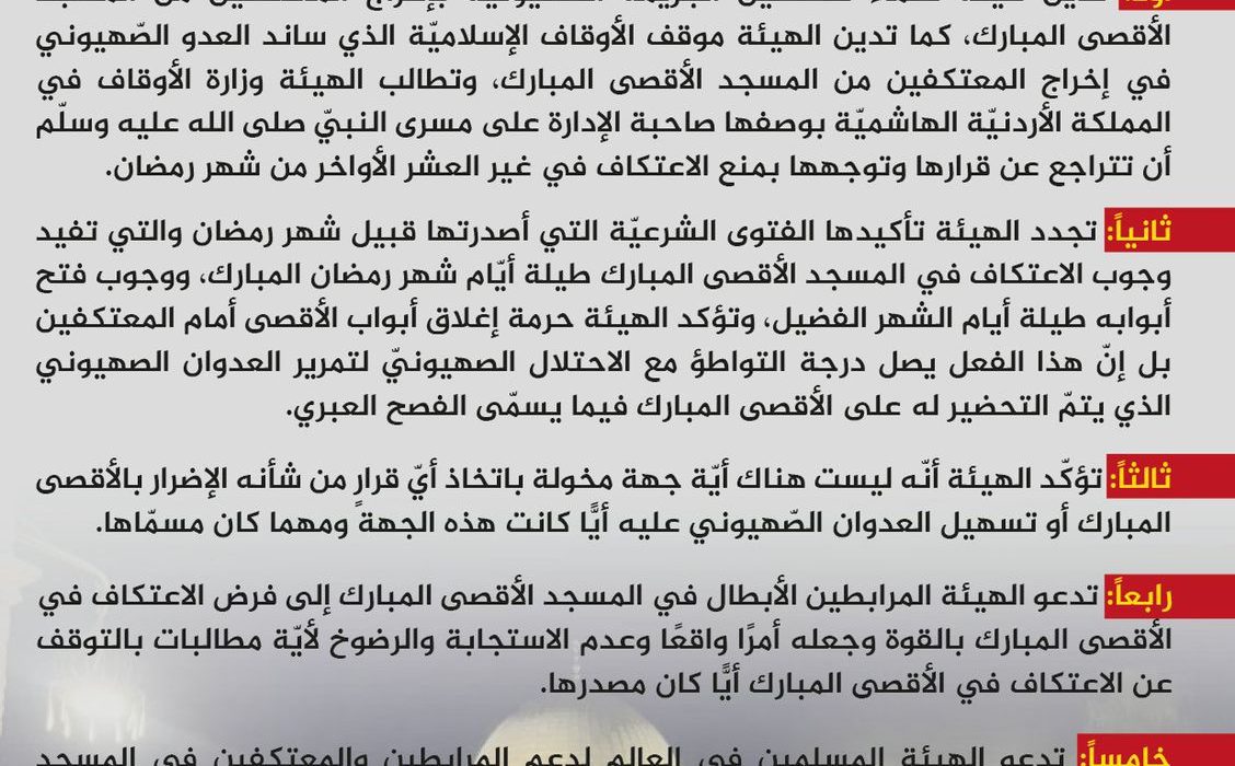 كما أدانت الهيئة في بيان مكتوب، موقف الأوقاف الإسلامية الذي ساند الاحتلال في إخراج المعتكفين من المسجد الأقصى المبارك.