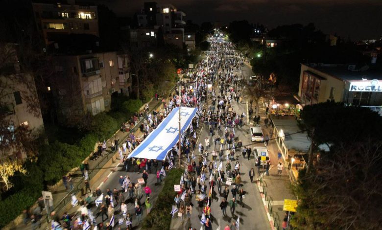 وتظاهر عشرات الآلاف في تل أبيب والعديد من المفارق والبلدات ضد حكومة نتنياهو وخطة إضعاف القضاء وتقويض صلاحيات المحكمة العليا، ونُظمت المظاهرة المركزية في شارع “كابلان” بتل أبيب، كما نظمت مظاهرة في نتانيا.