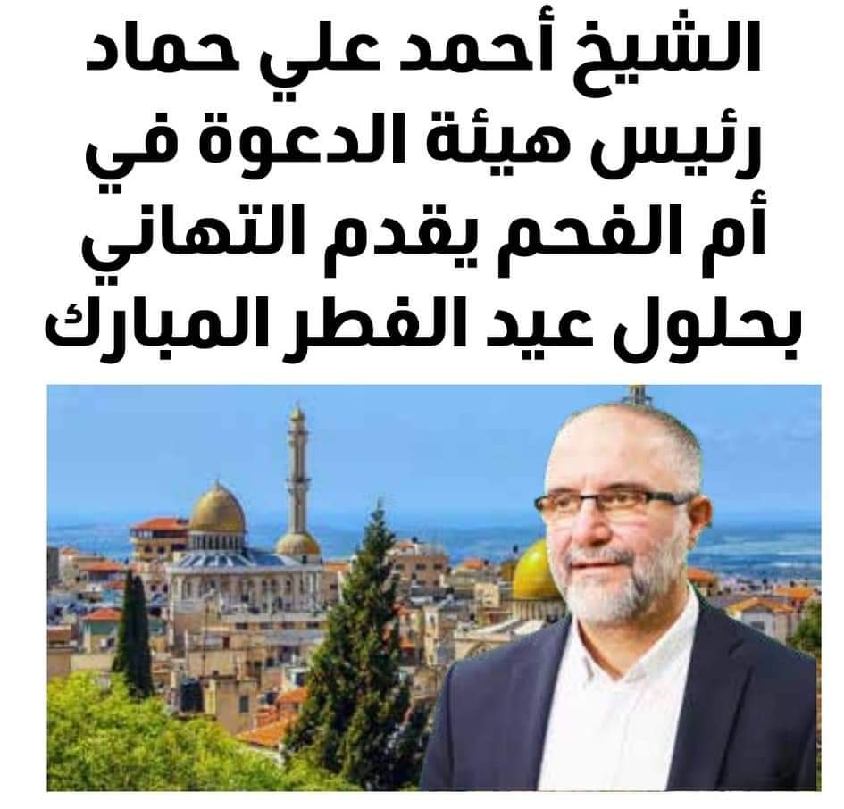 بإسمي واسم هيئة الدّعوة في أم الفحم يطيب لي أن أتقدّم بأجمل التهاني والتبريكات بمناسبة عيد الفطر المبارك لأهلنا في أم الفحم والداخل الفلسطيني ولشعبنا وأمتنا، سائلا المولى جلّ في علاه ان يعيده علينا وعلى الأمّة الاسلاميّة جمعاء باليُمن والبركات.
