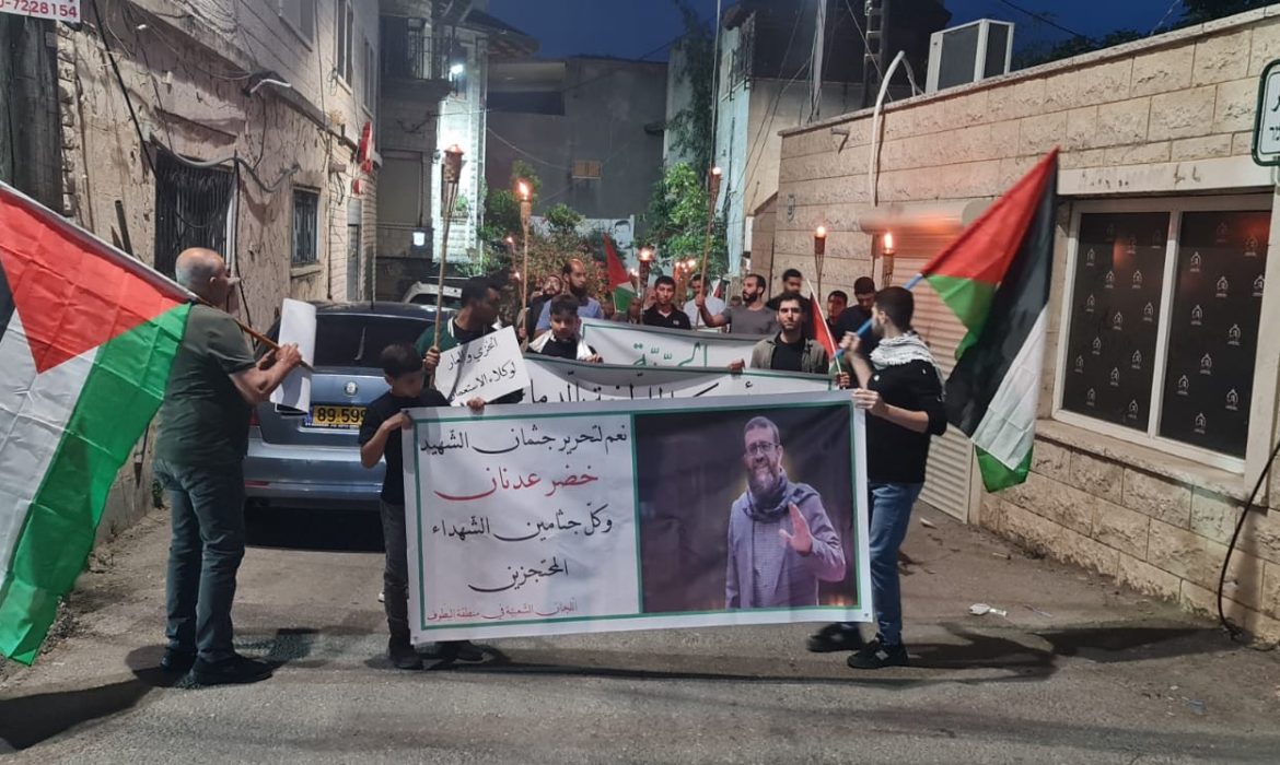 ورفع المشاركون الاعلام الفلسطينية واللافتات المنددة بالعدوان على غزة ولافتات تدعو إلى الافراج عن الأسير وليد دقة وأخرى تطالب بتحرير جثمان الشهيد خضر عدنان.