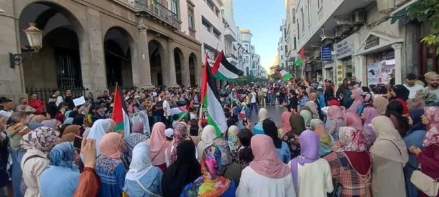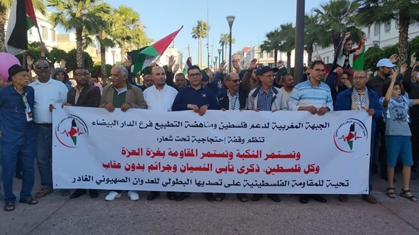 وفي مدينة الدار البيضاء، رفع المئات من المشاركين في مسيرة دعت إليها الجبهة المغربية، شعارات نددت باستمرار التطبيع مع كيان الاحتلال، رغم جرائمه المتواصلة من 75 عاماً، وآخرها العدوان على قطاع غزّة.