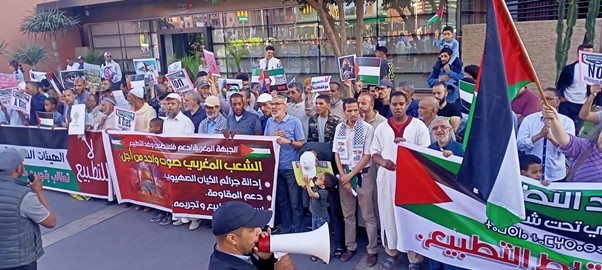 وردد المشاركون هتافات، أكّدت على أنّ التطبيع خيانة للشعب الفلسطيني والمغربي، وشددت على رفض الشعب المغربي لهذا المسار الخياني.