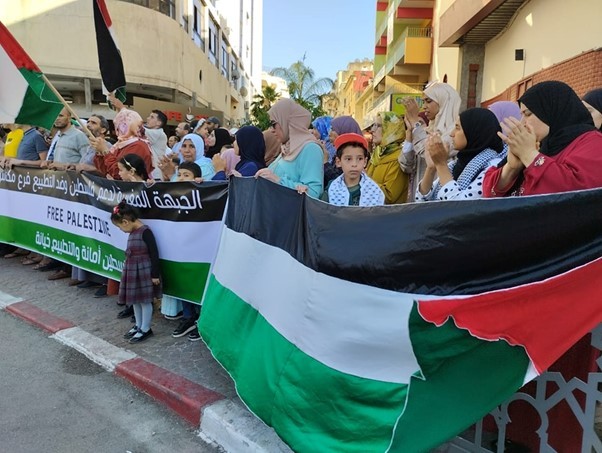 ورفع المحتجون، خلال الوقفة التي استمرت لساعة، الأعلام الفلسطينية إلى جانب لافتات كُتب عليها “فلسطين أمانة والتطبيع خيانة”، “نضال متواصل لإسقاط التطبيع”، “القدس في خطر”، “الأقصى يستغيث”، “لا للتطبيع مع الصهاينة”.