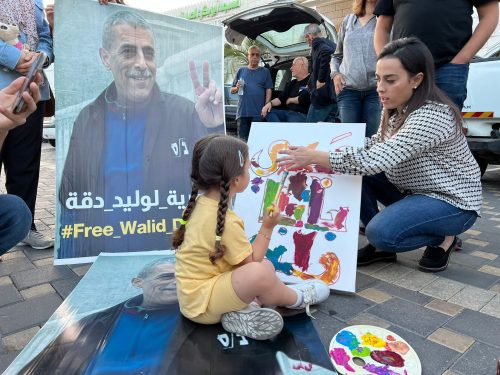 ورفع المشاركون في الوقفة لافتات حملت صور الأسير دقة، إذ كتب على بعض منها “الحرية لوليد”، “وليد لازم يرجع على البيت”، “حرية وليد دقة مطلبنا”، “وليد بحاجة للعائلة”.