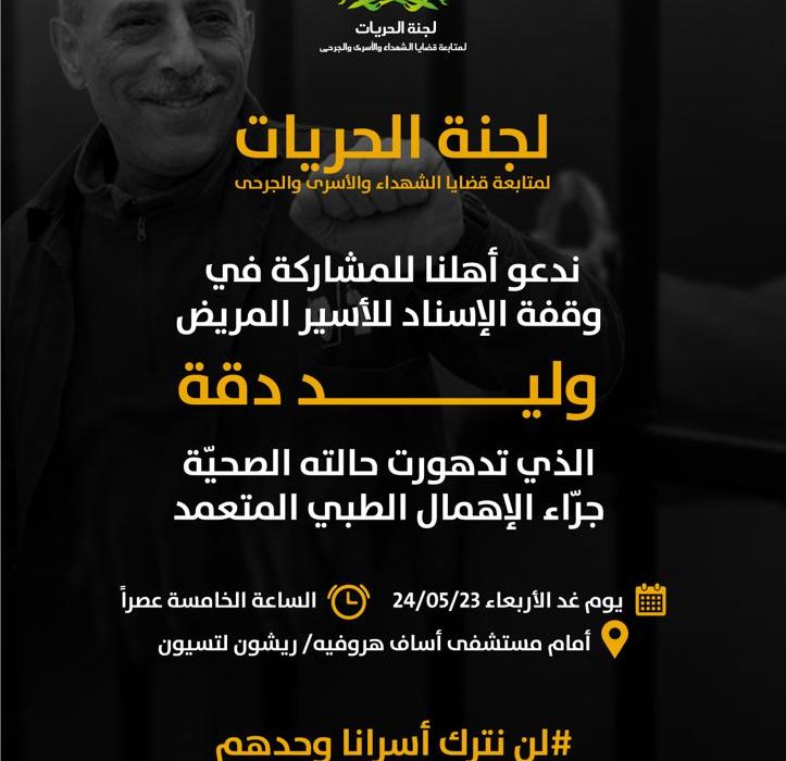 يشار إلى أن لجنة الحريات المنبثقة عن لجنة المتابعة العليا، تنظم عصر اليوم الأربعاء (الخامسة) وقفة إسناد للأسير المريض وليد دقة أمام مستشفى “أساف هروفيه” (في ريشون لتسيون) حيث يمكث دقة.