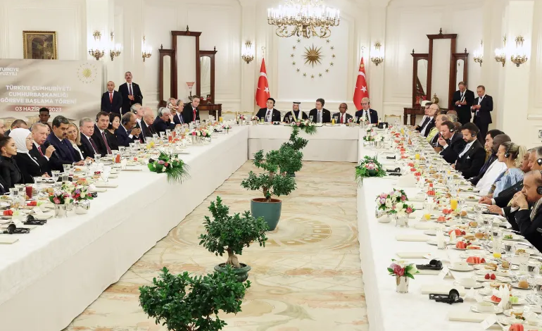 وأقيمت المأدبة في قصر جانقايا الرئاسي بالعاصمة أنقرة، وأعقبت يوما حافلا شهد أداء الرئيس أردوغان اليمين الدستورية بعد فوزه في جولة الإعادة بالانتخابات الرئاسية الأحد الماضي، وكذلك الكشف عن تشكيلة الحكومة التركية الجديدة.