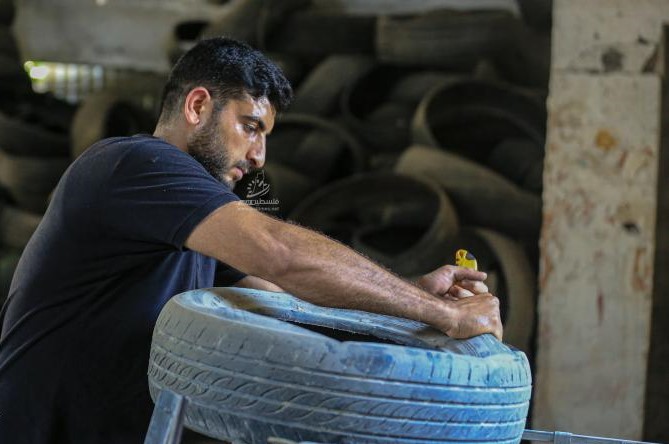 لم يجد الشاب الفلسطيني مدين حلس (27 عاما)، طريقة مميزة لمحارية الأضرار البيئية الناجمة عن تكدس إطارات السيارات التالفة في قطاع غزة، إلا من خلال تدويرها واستخدامها في صناعات أخرى.