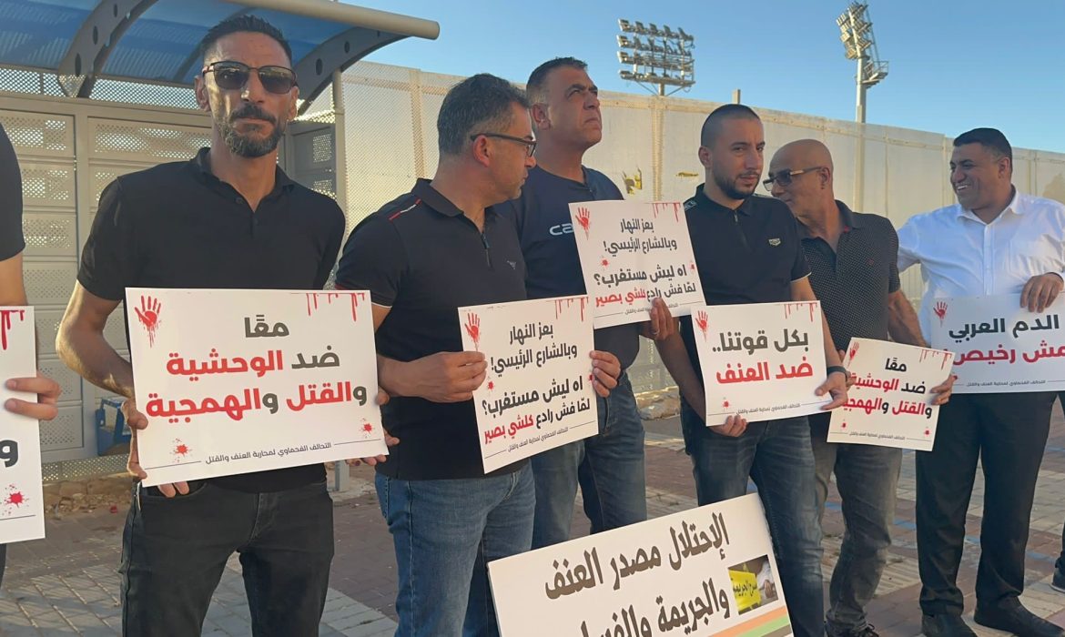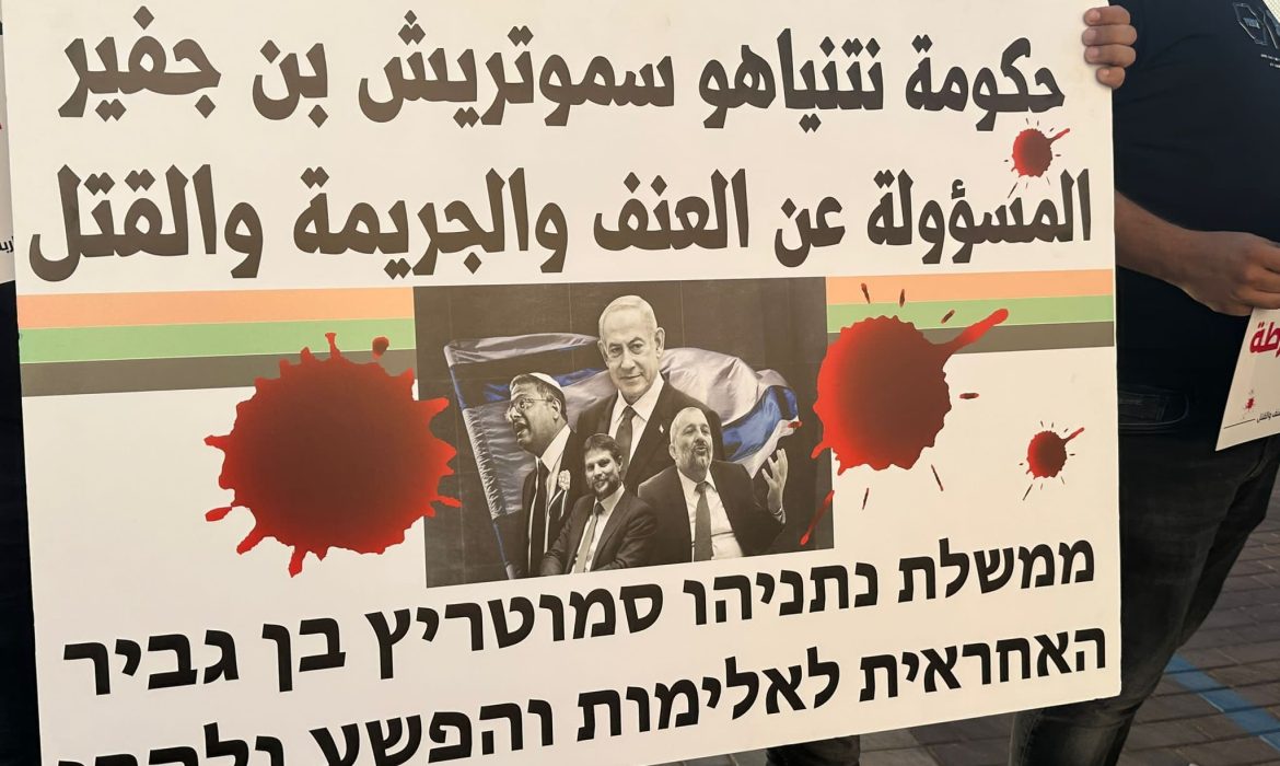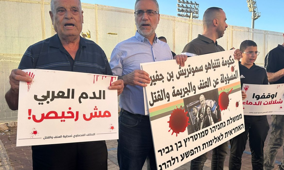 ورفع المشاركون في الوقفة، لافتات كُتبت عليها شعارات تطالب بتحرُّك السلطات لوقف الجريمة، كُتب على بعضها: “الدم العربي مش رخيص”، و”حكومة (بنيامين) نتنياهو (بتسلئيل) سموتريتش (إيتمار) بن غفير، هي المسؤولة عن الجريمة في المجتمع العربي”، و”أوقفوا شلال الدماء”، و”معًا ضد تقاعس الشرطة”، و”معًا ضد الوحشية والقتل والهمجية”.