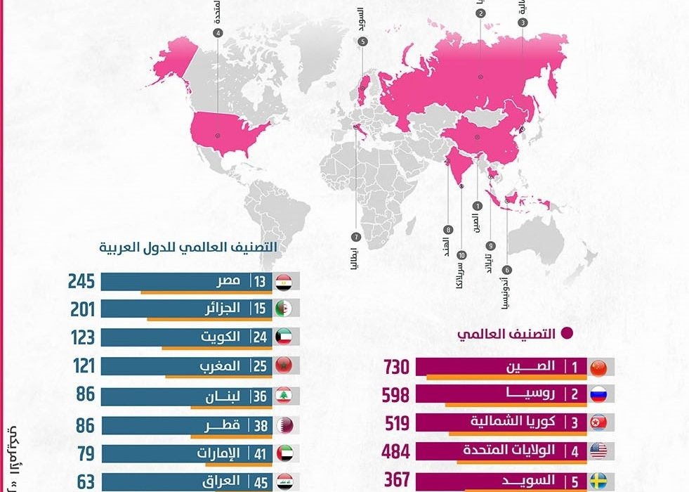 بينما حلت مصر في المرتبة الـ13 عالمياً والأولى عربياً بامتلاكها 245 قطعة بحرية، تلتها الجزائر في المرتبة الـ15 عالميا والثانية عربياً بـ201 قطعة بحرية.