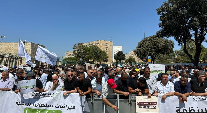 يتظاهر المئات من رؤساء ومستخدمي السلطات المحلية العربية، في هذه الأثناء أمام مكتب رئيس الحكومة في القدس، اليوم الإثنين، احتجاجا على تجميد الميزانيات للسلطات المحلية العربية، وتفاقم الجريمة في المجتمع العربي، وذلك تلبية لدعوة اللجنة القطرية لرؤساء السلطات المحلية العربية.