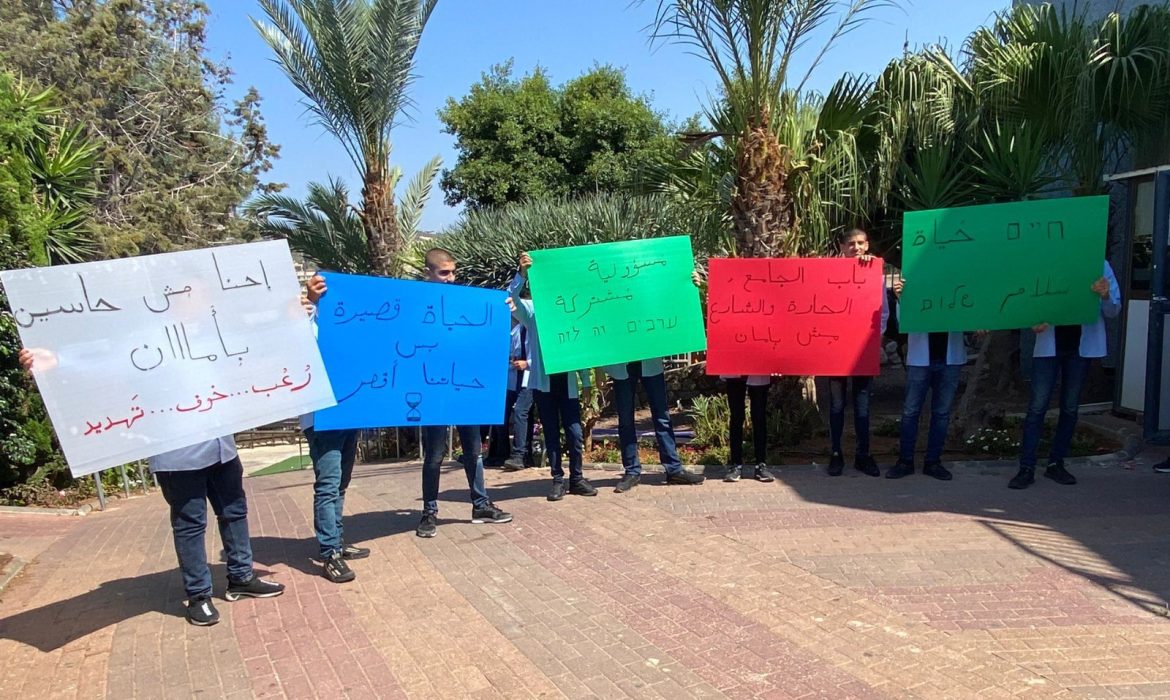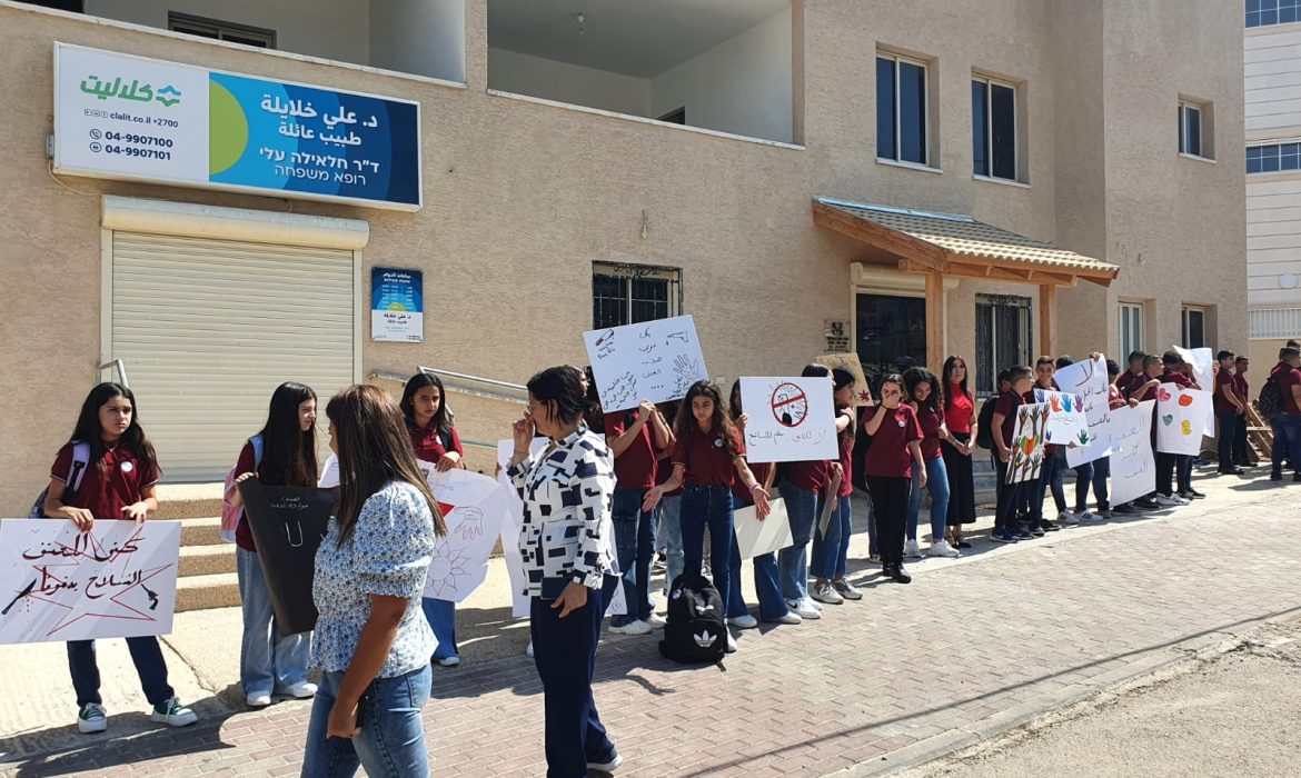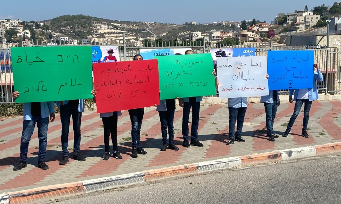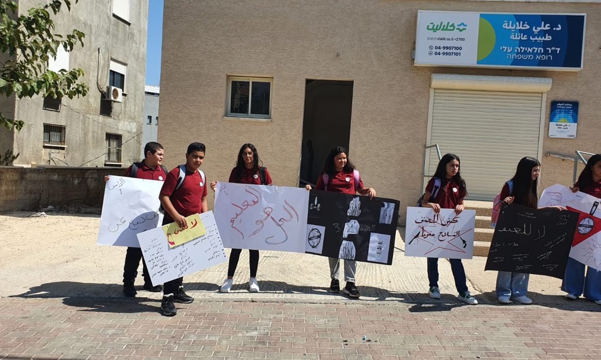 ورفع الطلاب لافتات حملت شعارات تندد بالعنف المستشري في المجتمع العربي والذي وصل إلى استهداف شخصيات قيادية وجماهيرية، كالشيخ سامي مصري إمام مسجد “قباء” في كفر قرع ورئيس حركة الدعوة والإصلاح في الداخل.