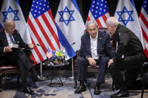 نتنياهو وغالانت خلال لقائهم بايدن في تل أبيب، أول من أمس (أ.ب.)