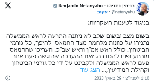وكتب نتنياهو في منشور على مواقع التواصل الاجتماعي: “لم يتلق رئيس الحكومة نتنياهو، في أي مرحلة، إنذارا بخصوص نوايا حماس للحرب”.