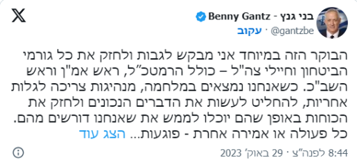 وواصل غانتس حديثه لقوى الأمن “كلنا معكم وخلفكم لا تنظروا إلى الأعلى أو إلى الخلف، واصلوا مهمتكم”.