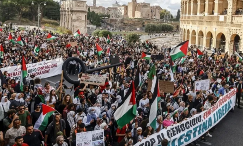 وتزامنت مظاهرة روما، السبت، مع انطلاق وقفات احتجاجية ومسيرات مليونية في العديد من الدول حول العالم تنديدا باستمرار آلة الحرب الإسرائيلي بالفتك بالمدنيين في قطاع غزة أمام أنظار العالم.