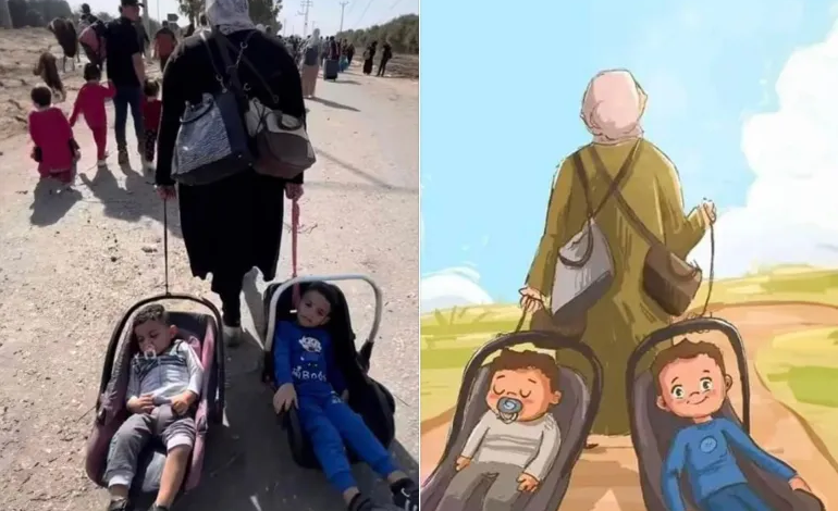ولكن من بين مئات المقاطع والصور هناك فيديو لفت انتباه رواد العالم الافتراضي لامرأة غزاوية تسحب طفليها خلال نزوحها من شمال قطاع غزة إلى جنوبه، ووثق المصور معتز عزايزة تلك اللحظة، ونشرها عبر حسابه على إنستغرام وعلق عليها بالقول: “استمرت في سحب طفليها لأكثر من 5 ساعات، أي ما يعادل 14 كيلومترا”.