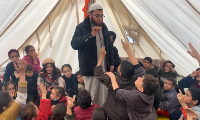 في مشهد مهيب يحتشد أطفال ذكورا وإناثا داخل خيمة مقامة بساحة مدرسة في حي الجنينة بمدينة رفح تؤوي نازحين -أغلبيتهم من شمال القطاع- يتلون القرآن الكريم ويتعلمون الفرائض والسنن، ويتفاعلون مع دروس دينية لدعاة شباب تطوعوا للقيام بجولات على مراكز الإيواء المنتشرة في المدينة، بهدف بث الطمأنينة في نفوس النازحين -خاصة الأطفال- في ظل حرب إسرائيلية شرسة ومتصاعدة في شهرها الرابع على التوالي.