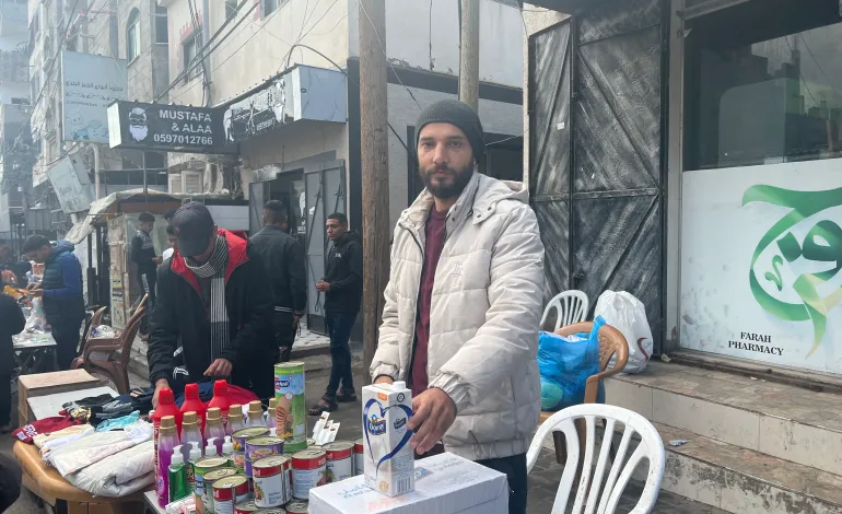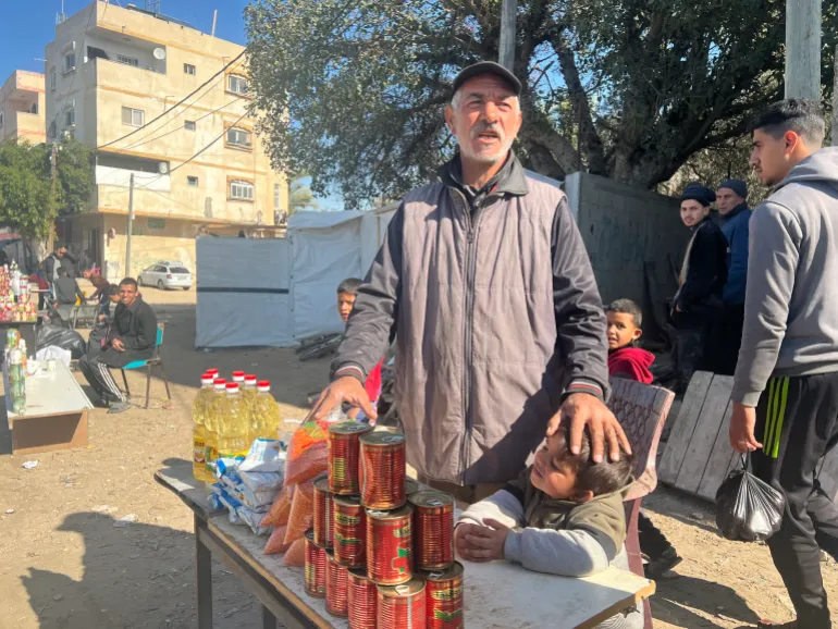 الصيدلاني محمد حسونة يبيع على بسطة في مخيم بدير البلح بعد أن دمرت إسرائيل منزله وصيدليته في مدينة غزة