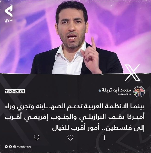 وقال أبو تريكة: “بينما الأنظمة العربية تدعم الصهاينة وتجري وراء أمريكا يقف البرازيلي والجنوب افريقي أقرب إلى فلسطين”.