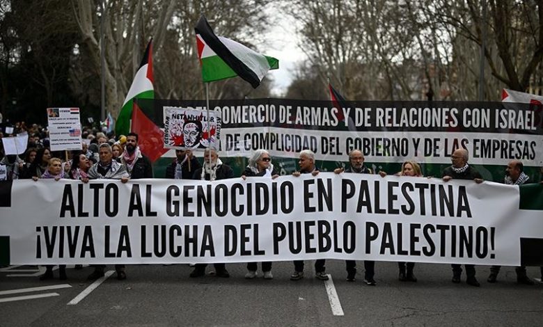 تظاهر مئات آلاف الأشخاص في إسبانيا، الأحد، للمطالبة بحظر تجارة الأسلحة مع إسرائيل ودعم فلسطين.