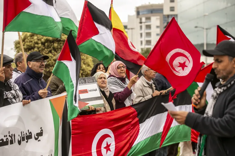 كما شارك عشرات التونسيين في وقفة تضامنية مع الشعب الفلسطيني، ورفع المحتجون لافتات تدعو إلى وقف العدوان الإسرائيلي على القطاع، كما تطالب بسَنّ قانون لتجريم كل أشكال التطبيع مع إسرائيل.
