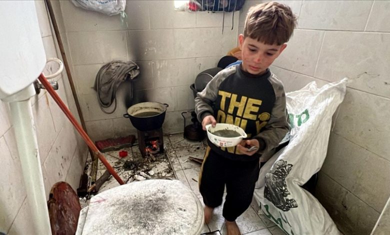 وبجانب المرحاض، يُضع الفلسطيني موقد النيران الذي أشعله بالورق والحطب، ليطهو حساء الخبيزة(نبتة برية خضراء اللون) لأطفاله الذين يتضورون جوعًا في ظل نقص الطعام في محافظات شمالي قطاع غزة وانتشار المجاعة.