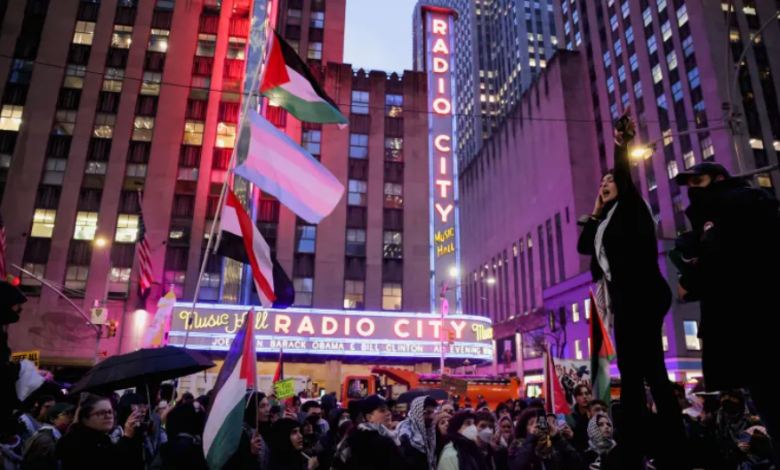 تجمع مئات المتظاهرين المؤيدين لفلسطين في نيويورك خارج حفل لجمع التبرعات لحملة الرئيس الأميركي جو بايدن الانتخابية بحضور الرئيسين السابقين باراك أوباما وبيل كلينتون، وذلك احتجاجا على سياساته الداعمة للحرب الإسرائيلية على غزة.
