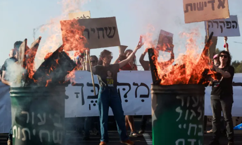باستخدام براميل مشتعلة… عشرات المتظاهرين يغلقون طريقا سريعا في تل أبيب