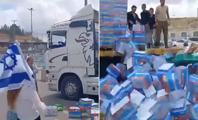 ووثقت المقاطع عملية سرقة شاحنات المساعدات الإنسانية وتوقيفها من طرف المستوطنين، خاصة شاحنات المساعدات القادمة من الأردن عبر معبر “إيريز”، وقيامهم بسرقتها وإتلافها.