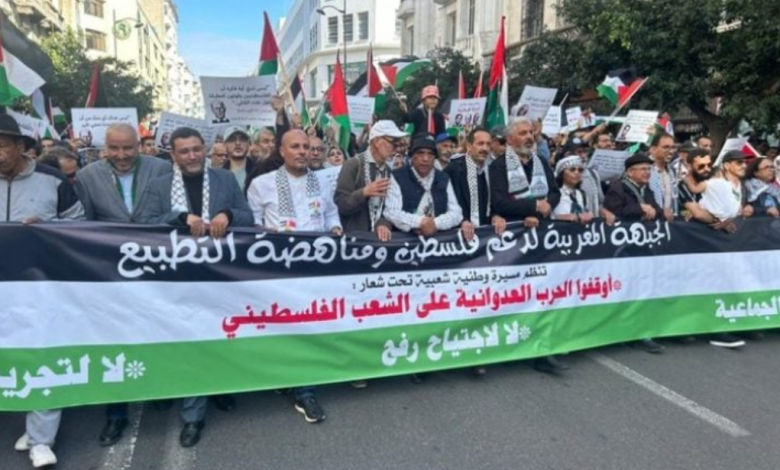 وتشهد العديد من المدن المغربية، بينها العاصمة الرباط، وقفات تضامنية مع قطاع غزة الذي يتعرض لحرب إسرائيلية منذ 7 أكتوبر/ تشرين الأول الماضي، طالب فيها المشاركون بقطع العلاقات مع تل أبيب ووقف الحرب وإدخال المساعدات.