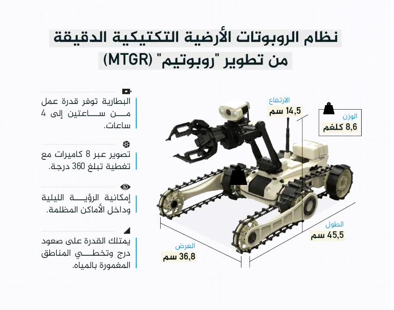 في مايو/أيار الماضي أعلنت شركة “روبوتيم” (Roboteam) الإسرائيلية، المتخصصة في تصنيع الأنظمة الأرضية المُسيّرة والروبوتات القتالية، عن تلقيها أمر شراء من سلاح مشاة البحرية الأميركية (المارينز) لتوريد 200 قطعة من أنظمة الروبوتات الأرضية التكتيكية الدقيقة (إم تي جي آر)، في صفقة تبلغ قيمتها نحو 30 مليون دولار. وقالت الشركة إن مشاة البحرية اختاروا نظام “إم تي جي آر 15” (MTGR15) الذي يعدّ واحدًا من 5 أنواع من المُسيرات الأرضية التي تصنعُها، وهو من فئة الروبوتات التكتيكية الصغيرة الحجم، إذ يزن نحو 8 كيلوغرامات ولا يتجاوز طوله نصف متر، مما يسمح بإمكانية حمله داخل حقيبة ظهر في ساحة المعركة.