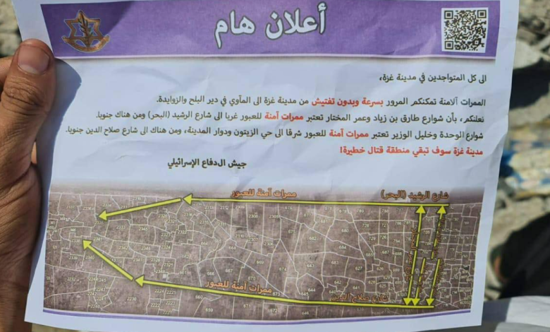 وحددت المناشير الموجهة إلى “كل المتواجدين في مدينة غزة” باللغة العربية، ما أسماها الاحتلال “طرقا آمنة” رُسمت عليها أسهم تشير إلى طرق وممرات الخروج من المدينة نحو الجنوب. وحذر الجيش من أن “مدينة غزة سوف تبقى منطقة قتال خطيرة”.