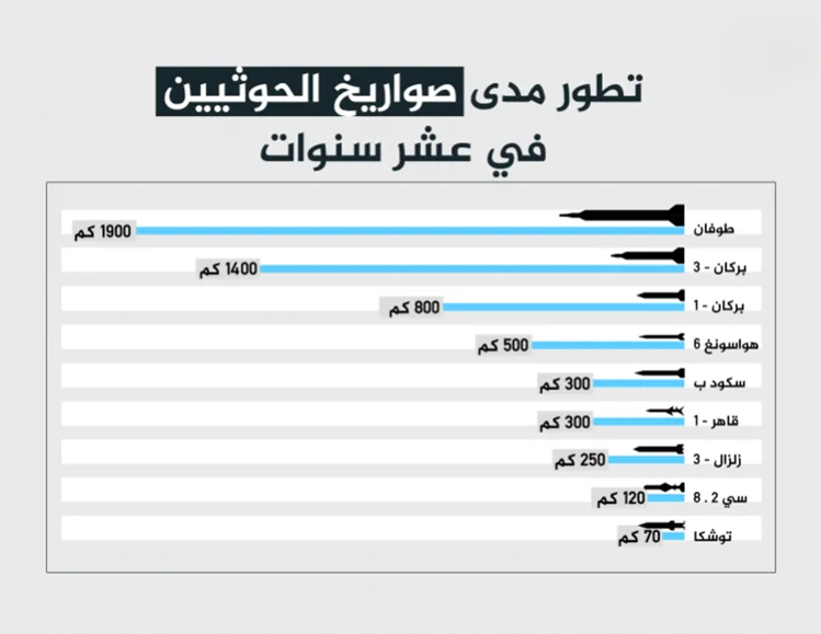 ويمكن للمتأمل في تاريخ تطوير ترسانة صواريخ الحوثيين أن يلاحظ أنهم يحدّثون مدى ترسانتهم الصاروخية بسرعة كبيرة، ولنتأمل خطَّ سيرٍ زمنيا قصيرا من 2015 وحتى الإعلان عن “طوفان” مؤخرا، فمثلا في 2015 أعلن الحوثيون عن إصدار صواريخ “قاهر-1” و”قاهر-إم 2″، وهي تنضم إلى عائلة من صواريخ أرض-جو السوفيتية من النوع “سام في 755” المعدلة لمهام الهجوم الأرضي، يمكن لهذه الصواريخ أن تصل إلى مدى 250-400 كم.