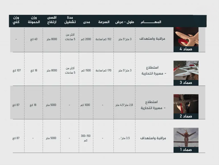 وأخيرا أُعلن في عام 2021 عن “صماد-4″، التي تؤدي مهام مزدوجة بين الاستطلاع والعمليات الهجومية، ومن المحتمل أنها تمتلك ميزة التخفي مع مدى يصل إلى 2000 كيلومتر.