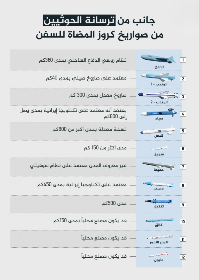 وإلى جانب ما سبق، يمتلك الحوثيون صواريخ روبيج، وهو نظام روسي للدفاع الساحلي، يستخدم صواريخ “كي إتش – 35 يو آي” المضادة للسفن، ويصل مداها إلى 260 كيلومترا، وتعمل بتقنية القشط البحري، أي إنها تسافر بالقرب من سطح الماء لتجنب الرادار، ويحمل الواحد منها رأسا حربيا شديد الانفجار يبلغ وزنه 145 كغم صُمِّم ليخترق الحواجز والمقصورات أفقيا قبل أن ينفجر داخل السفينة.