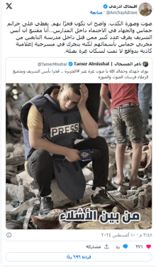 وفي السياق نفسه، تسارعت التنديدات بتصريحات المتحدث العسكري باسم جيش الاحتلال الإسرائيلي، على التعليقات التي صاحبته تدوينته، فيما توالت المطالب بضرورة الحماية العاجلة للصحفي الفلسطيني، أنس الشريف.