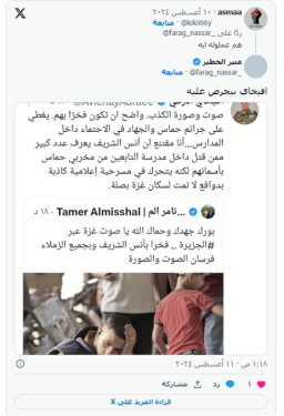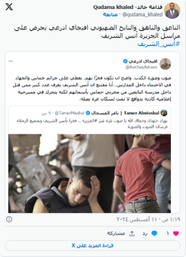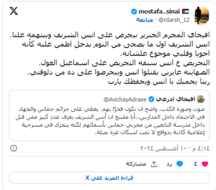 وتابع أدرعي، عبر تغريدة له، على صفحته بموقع التواصل الاجتماعي “إكس”: “أنا مقتنع أن أنس الشريف يعرف عددا كبيرا ممن قتل داخل مدرسة التابعين من مخرّبي حماس بأسمائهم، لكنه يتحرك في مسرحية إعلامية كاذبة بدوافع لا تمت لسكان غزة بصلة”، ما خلّف موجة استنكار كبيرة، ومطالب مُتسارعة بضرورة حماية الصحفي الفلسطيني، من التحريضات الإسرائيلية ضدّه.