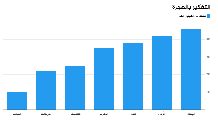 فقد أظهر الاستبيان رغبة كبيرة لدى التونسيين في مغادرة بلادهم، إذ بلغت نسبة من يفكرون منهم بالهجرة 46% من المستطلعة آراؤهم، يليهم الأردن بنسبة 42%، ثم لبنان 38%. بينما كان الكويتيون أقل من يفكر بالهجرة من المستطلعة آراؤهم بنسبة 10%.
