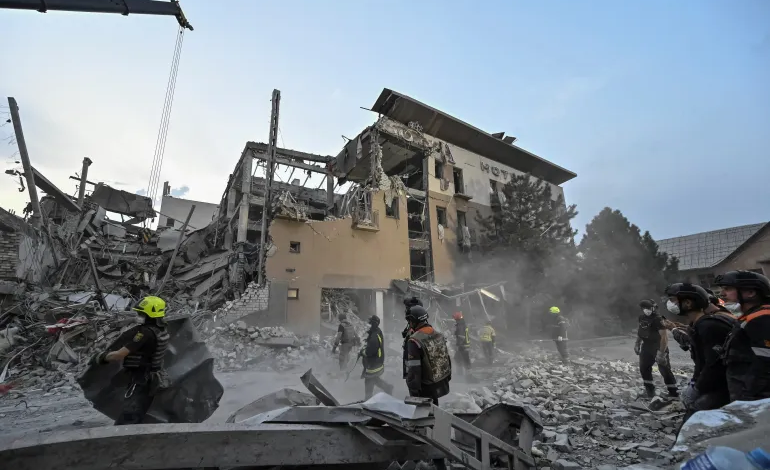 وأظهرت صور متداولة أضرارا بأحد الفنادق المأهولة في المدينة بعد إصابته بصاروخ، في وقت واصلت فيه فرق الإنقاذ البحث لساعات عن 5 أشخاص آخرين يعتقد أنهم كانوا تحت الأنقاض.