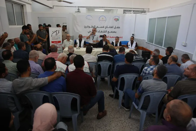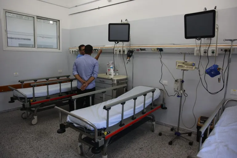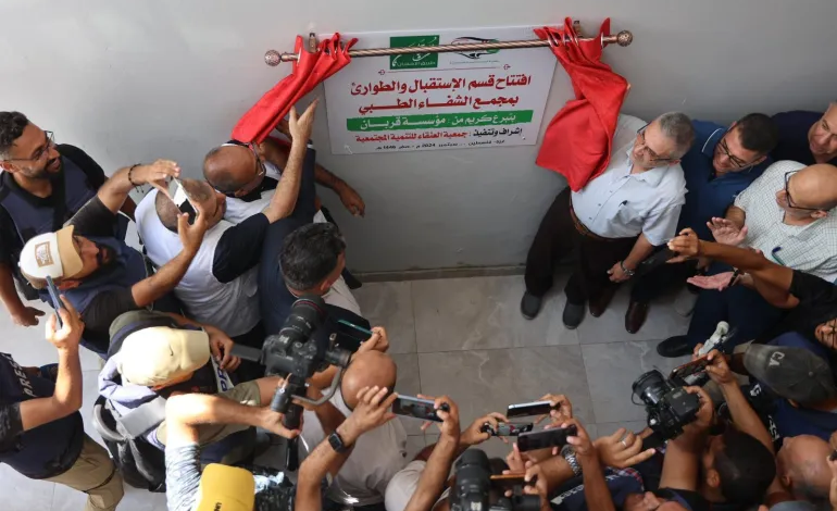 إلى الداخل قليلا، يتجمع العشرات من ممثلي وزارة الصحة الفلسطينية والمؤسسات الطبية والإغاثية، لإزاحة الستار عن حكاية جديدة تعلن “أن الشفاء فتح ذراعيه -مجددا- لاستقبال مرضاه”.