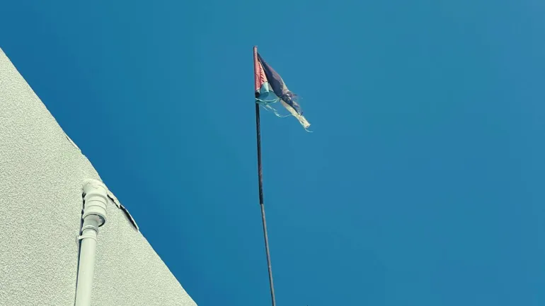 من بعيد وقبل الوصول، ترى علما فلسطينيا ممزقا ينتصب فوق مجمع الشفاء المتفحّم، يرفرف رغم حالته التي يرثى لها، يحاكي في ذلك ما يُقال عن قيامة الفلسطيني ووقوفه رغم كل الندوب التي تنزف فيه ومنه.