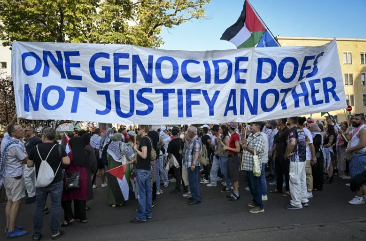ورفع المتظاهرون لافتات كتب عليها عبارات من قبيل “الإبادة الجماعية لا تبرر إبادة أخرى”، و”ألمانيا توقفي عن تسليح نظام (رئيس الوزراء الإسرائيلي بنيامين) نتنياهو الفاشي”.