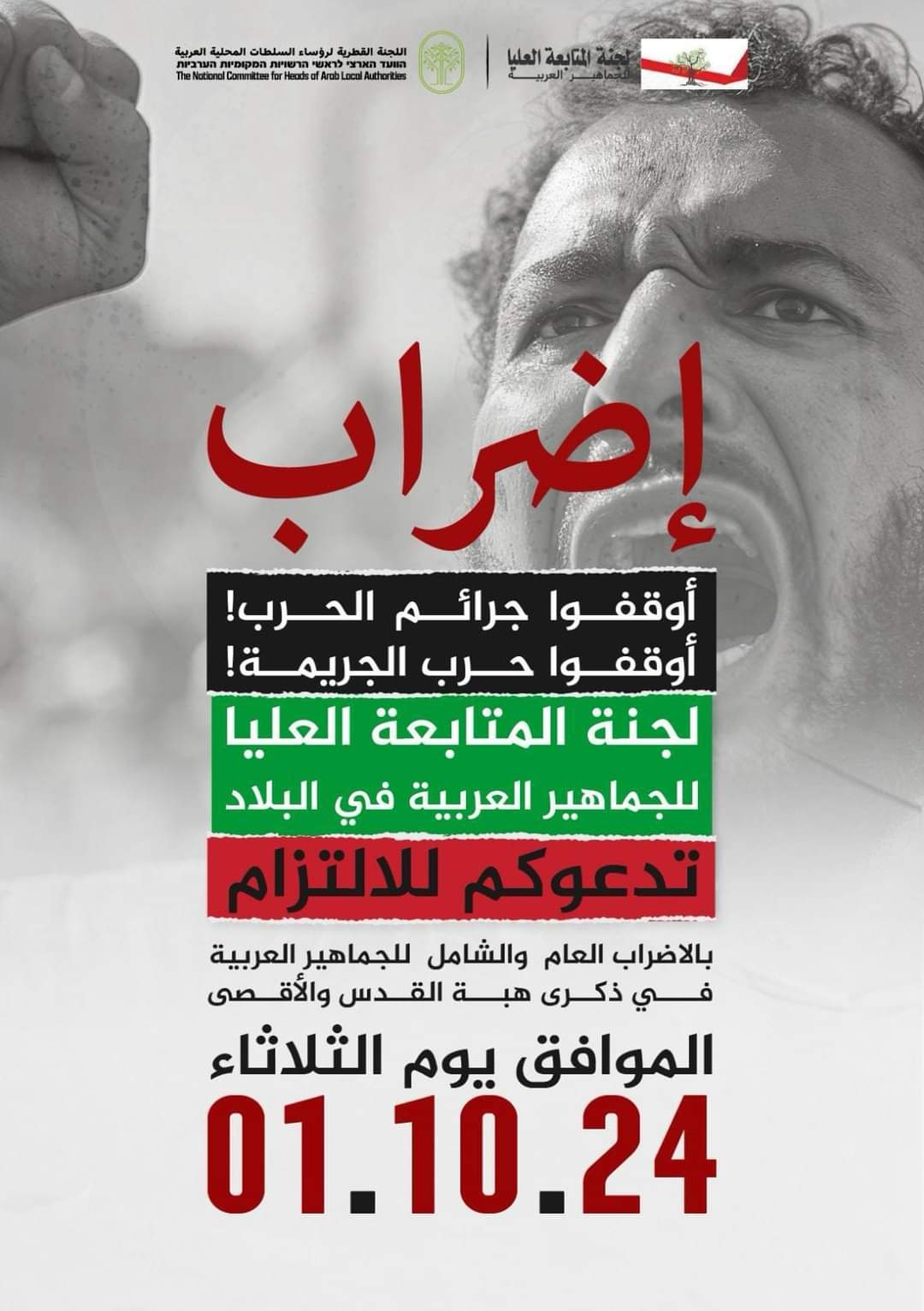دعت لجنة المتابعة العليا بجميع مركباتها: اللجنة القطرية لرؤساء السلطات المحلية العربية وجميع الأحزاب السياسية مع اللجان الشعبية ولجنة متابعة قضايا التعليم العربي، جميع أبناء شعبنا ان يعملوا على إنجاح الاضراب العام في 1\10\2024 ,في ذكرى هبة القدس والاقصى ليكون إضرابا موحدا ومدويا وموقفا سياسيا سلميا وفيّا لذكرى الشهداء، في مواجهة جرائم الحرب وفي مواجهة حرب الجريمة التي تعصف بمجتمعنا.