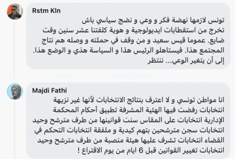 وعلق أحد المدونين على هذه النتائج بالقول إن الانتخابات الرئاسية في تونس التي أُقصي منها كل المترشحين الجدّيين، وسجنوا أو لوحقوا قضائيا، تعطي لرئيس الأمر الواقع قيس سعيد أكثر من 90%، وأشار إلى أنه لم يشارك في الانتخابات إلا مليونين ونصف مليون ناخب من أصل 9 ملايين لهم الحق في التصويت.